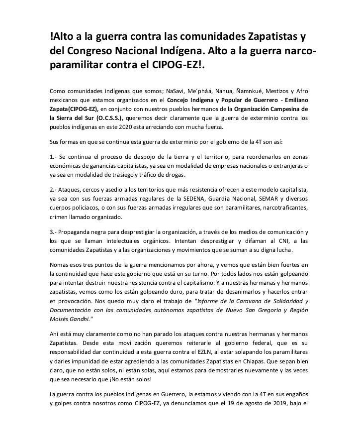 ¡Alto a la guerra contra las comunidades Zapatistas y del Congreso Nacional Indígena. Alto a la guerra narco-paramilitar contra el CIPOG-EZ!