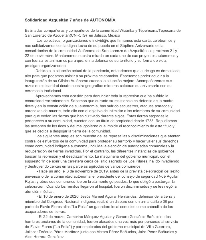 Carta de solidaridad a Azqueltán por sus 7 años de AUTONOMÍA