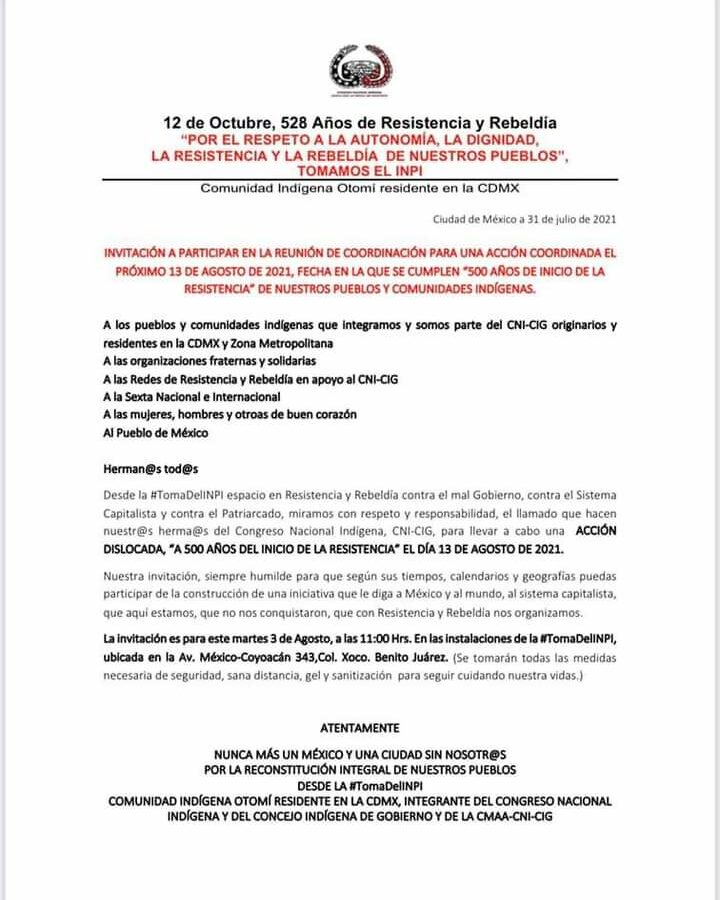 LLAMADO DEL CNI-CIG A PARTICIPAR EN LA “INICIATIVA NACIONAL POR LA VIDA” PROMOVIDA POR EL EZLN Y A LA ACCIÓN DISLOCADA “A 500 AÑOS DEL INICIO DE LA RESISTENCIA”