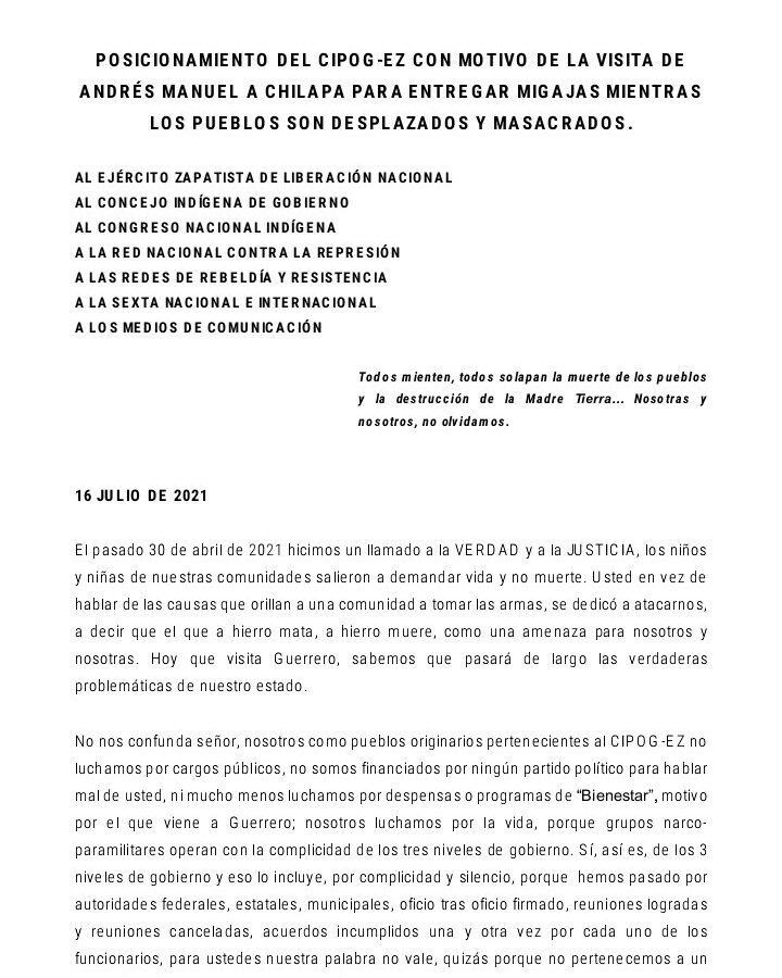 POSICIONAMIENTO DEL CIPOG-EZ CON MOTIVO DE LA VISITA DE ANDRÉS MANUEL A CHILAPA PARA ENTREGAR MIGAJAS MIENTRAS LOS PUEBLOS SON DESPLAZADOS Y MASACRADOS