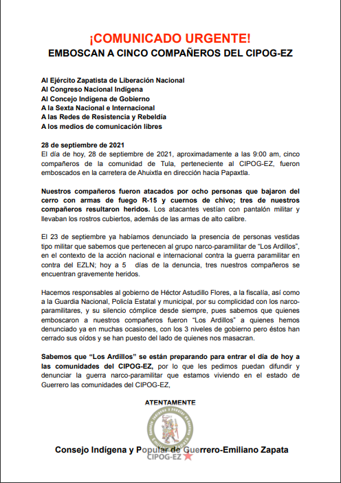 ¡COMUNICADO URGENTE! EMBOSCAN A CINCO COMPAÑEROS DEL CIPOG-EZ