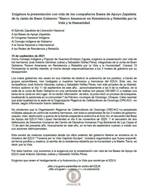 Exigimos la presentación con vida de los compañeros Bases de Apoyo Zapatista de la Junta de Buen Gobierno «Nuevo Amanecer en Resistencia y Rebeldía por la Vida y la Humanidad»