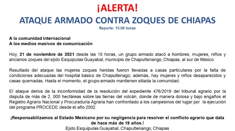 ¡Alerta! Ataque armado contra zoques de Chiapas.