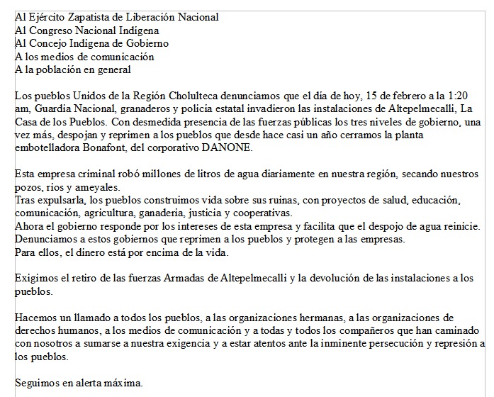 COMUNICADO URGENTE DE LOS PUEBLOS UNIDOS DE LA REGIÓN CHOLULTECA