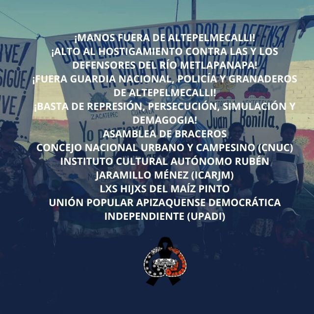 ¡MANOS FUERA DE ALTEPELMECALLI! ¡Alto al hostigamiento contra las y los defensores del Río Metlapanapa!…