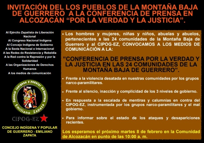 INVITACIÓN DE LOS PUEBLOS DE LA MONTAÑA BAJA DE GUERRERO A LA CONFERENCIA DE PRENSA EN ALCOZACÁN “POR LA VERDAD Y LA JUSTICIA”