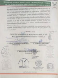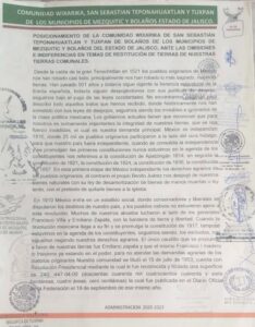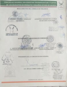 Atentamente: Autoridades tradicionales y agrarias de la comunidad wixárika de San Sebastián Teponahuaxtlan y Tuxpan de los municipios de Mezquitic y Bolaños del Estado de Jalisco.