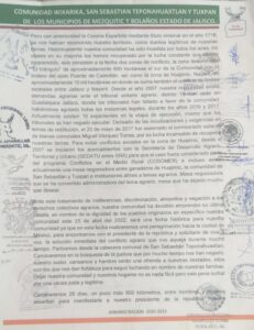 Ante este tratamiento de indiferencia, discriminación, atropellos y negación a los derechos colectivos agrarios, nuestra comunidad ha decidido emprender su última batalla en nombre de la dignidad de los pueblos originarios en específico nuestra comunidad este 25 de abril de 2022. Será una fecha histórica para nuestra comunidad ya que en esta fecha realizaremos una peregrinación hacia la Ciudad de México para encontrarnos con el presidente de la República y solicitarle de viva voz la solución inmediata del conflicto agrario que nos aqueja durante mucho tiempo. Partiremos desde la cabecera comunal de San Sebastián Teponahuaxtlán. Caminaremos en la búsqueda de la justicia que por mucho tiempo nos ha negado, nuestro sudor, cansancio y hambre serán una ofrenda a nuestras deidades, ellos son los que nos dan fortaleza para seguir luchando en nombre de nuestras familias. Dejar nuestra comunidad y nuestros hogares no es nada fácil pero vale la pena luchar por una causa justa y legítima.