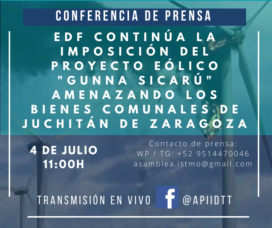 INVITACION A LA CONFERENCIA DE PRENSA: EDF CONTINUA LA IMPOSICION DEL PROYECTO EOLICO «GUNNA SICARÚ» AMENAZZANDO LOS BIENES COMUNALES DE JUCHITAN DE ZARAGOZA