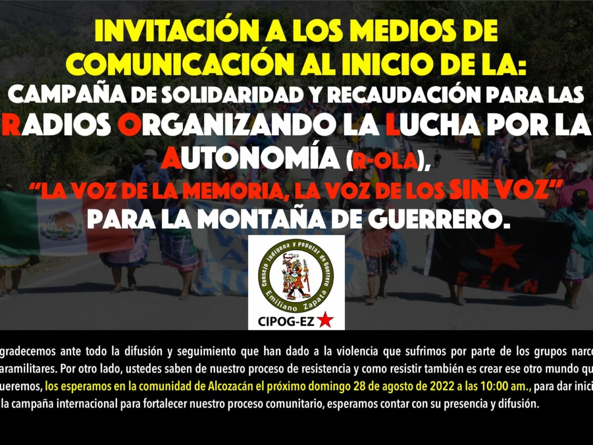 INVITACIÓN A LOS MEDIOS DE COMUNICACIÓN AL INICIO DE LA: CAMPAÑA DE SOLIDARIDAD Y RECAUDACIÓN PARA LAS RADIOS ORGANIZANDO LA LUCHA POR LA AUTONOMÍA (R-OLA) “LA VOZ DE LA MEMORIA, LA VOZ DE LOS SIN VOZ” PARA LA MONTAÑA DE GUERRERO
