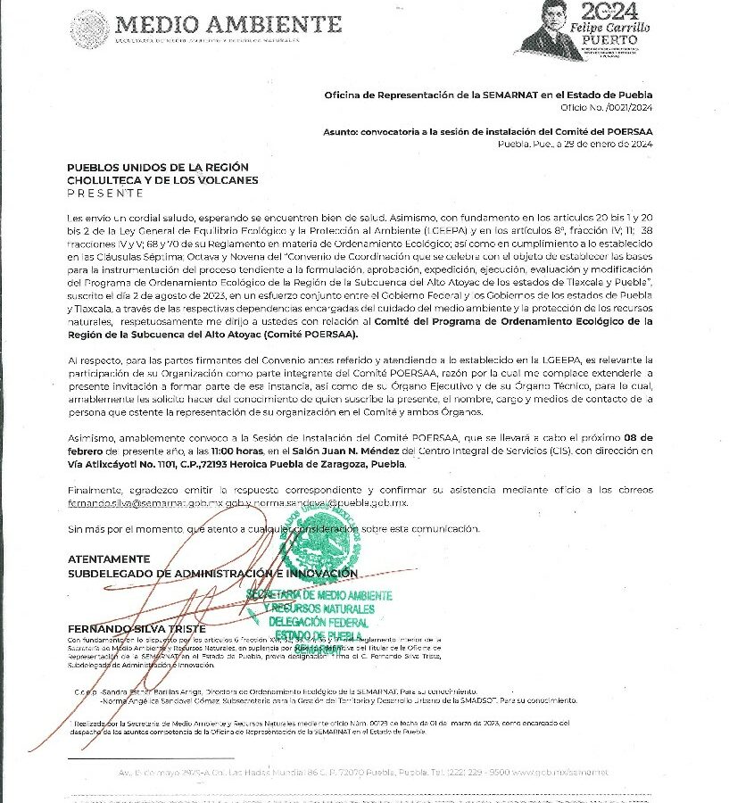 RESPUESTA PÚBLICA DE LOS PUEBLOS UNIDOS DE LA REGIÓN CHOLULTECA Y DE LOS VOLCANES A LA CONVOCATORIA A LA SESIÓN DE INSTALACIÓN DEL COMITÉ DEL PROGRAMA DE ORDENAMIENTO ECOLÓGICO DE LA REGIÓN DE LA SUBCUENCA DEL ALTO ATOYAC (POERSAA)
