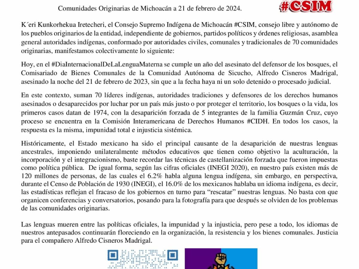 Las lenguas mueren entre las políticas oficiales, la impunidad y la injusticia: Consejo Supremo Indígena de Michoacán (CSIM)