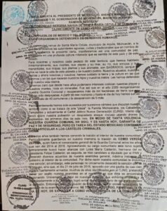 Permanentemente hemos sido acosados por sucesivos cárteles que disputan nuestro territorio como si se tratara de una “plaza”: la Familia Michoacana, los Caballeros Templarios y actualmente el Cartel Jalisco Nueva Generación (CJNG), mismo que lanzó sobre nuestra población un despiadado ataque -incluso usando drones y explosivos- los primeros días de este mes. EN MEDIO DE TANTA VIOLENCIA NUESTRA GUARDIA COMUNAL HA SIDO, Y ES HASTA HOY, GARANTÍA DE PAZ Y DE SEGURIDAD; PERO ES TAREA DEL ESTADO MEXICANO CONTENER Y DESARTICULAR A LOS CÁRTELES CRIMINALES.