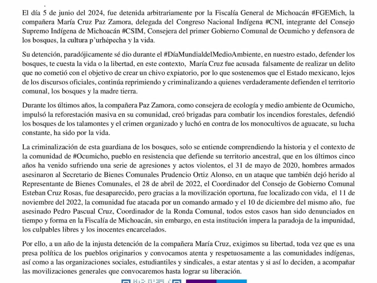 Se cumple un año del encarcelamiento de la ambientalista María Cruz Paz, comunidades exigen su liberación #CSIM