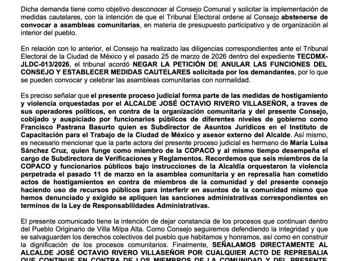 COMUNICADO DEL CONSEJO COMUNAL INDÍGENA NAHUA DE VILLA DE MILPA ALTA CON RESPECTO AL ACUERDO DEL TRIBUNAL ELECTORAL EL PASADO 25 DE MARZO DE 2026