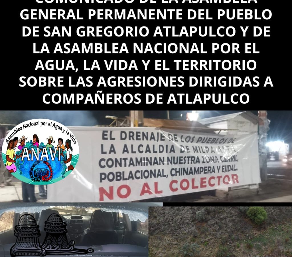 COMUNICADO URGENTE DE LA ASAMBLEA GENERAL PERMANENTE DEL PUEBLO DE SAN GREGORIO ATLAPULCO Y DE LA ASAMBLEA NACIONAL POR EL AGUA, LA VIDA Y EL TERRITORIO SOBRE LAS AGRESIONES DIRIGIDAS A COMPAÑEROS DE ATLAPULCO