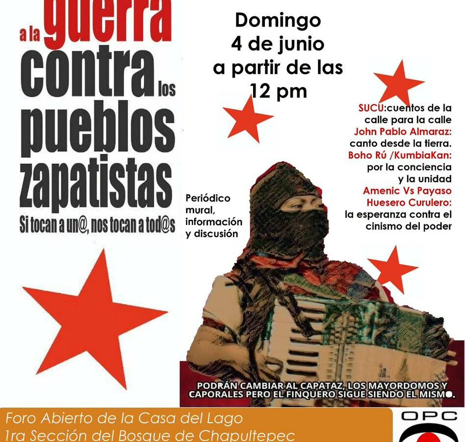 ALTO A LA GUERRA CONTRA LAS COMUNIDADES ZAPATISTAS Acto político cultural Domingo 4 de junio…