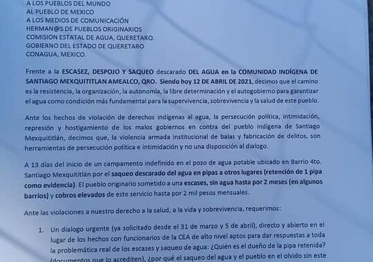 Comunicado de la comunidad indígena otomí de Santiago Mexquititlán, Querétaro.