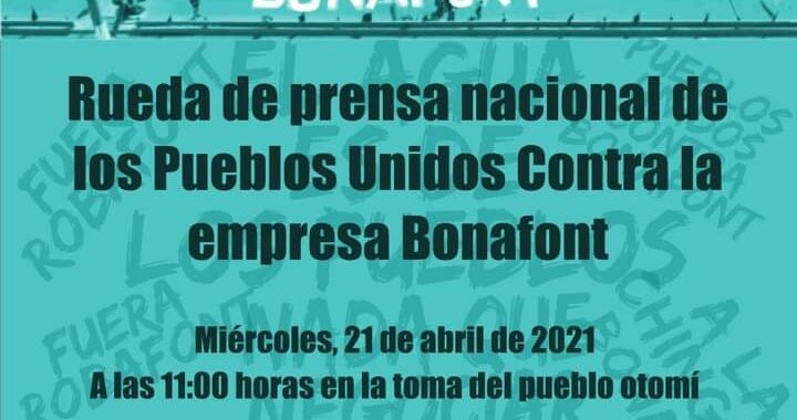 Los Pueblos Unidos por la vida y contra la empresa #Bonafont invitan a la rueda de prensa nacional que realizarán el próximo miércoles, 21 de abril de 2021, a las 11:00 horas…