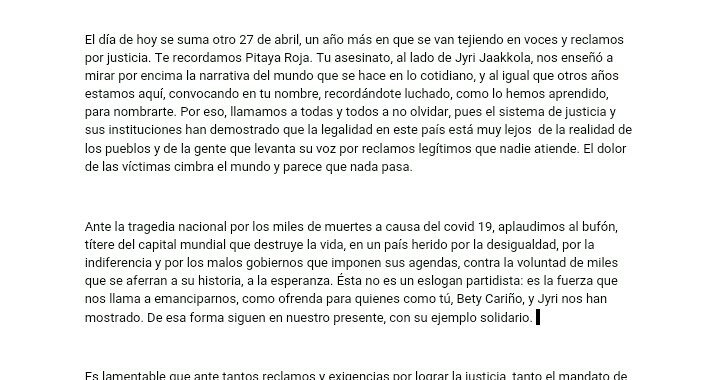 A los medios de comunicación A la opinión pública nacional e internacional A las organizaciones de Derechos Humanos A quienes luchan por la vida, que se abre paso sobre la muerte. Once…