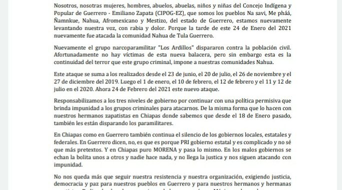 Ocosingo, Chiapas, México. 15 de febrero de 2021 Al pueblo de México A las organizaciones defensoras de los derechos humanos A los medios de comunicación Al Congreso Nacional Indígena y su Concejo…