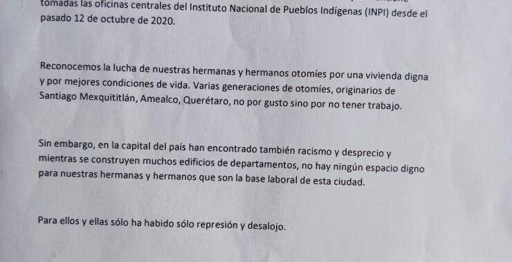 A todos los medios de comunicación, A las organizaciones sociales, Al Congreso Nacional Indígena, Al Consejo Indígena de Gobierno, A la población en general, Por medio de este comunicado, la comunidad indígena…