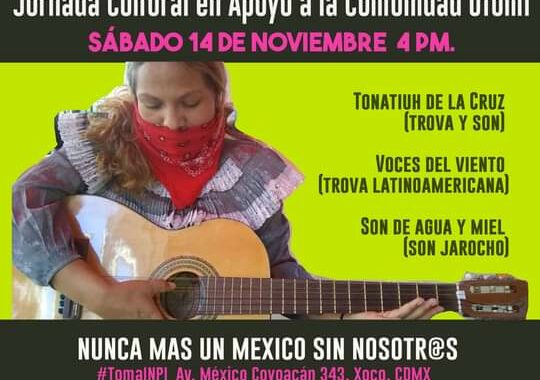 Jornada cultural en apoyo a la Comunidad Otomí Sábado 14 de noviembre 4:00 pm Tonatiuh de la Cruz (Trova y Son) Voces del viento (Trova Latinoamericana) Son de Agua y Miel (Son…