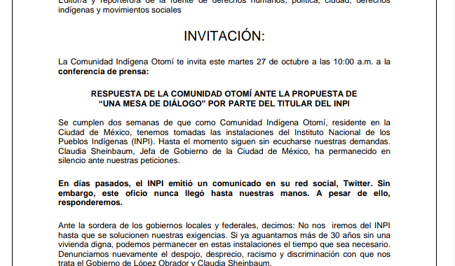 Sábado 24 de octubre de 2020 A la jefatura de información Editor/a y reportero/a de la fuente de derechos humanos, política, ciudad, derechos indígenas y movimientos sociales INVITACIÓN: La Comunidad Indígena Otomí…