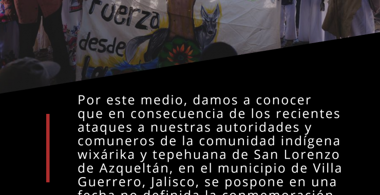 Por recientes agresiones se aplaza indefinidamente la conmemoración del 6to aniversario de autoridades agrarias autónomas de San Lorenzo Azqueltan, Jalisco.
