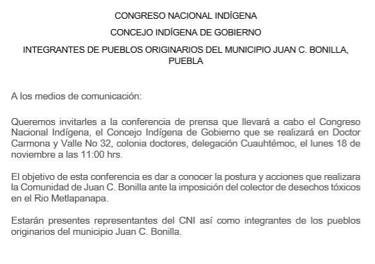 CONGRESO NACIONAL INDÍGENA CONCEJO INDÍGENA DE GOBIERNO INTEGRANTñES DE PUEBLOS ORIGINARIOS DEL MUNICIPIO JUAN C. BONILLA, PUEBLA A los medios de comunicación: Queremos invitarles a la conferencia de prensa que llevará a…