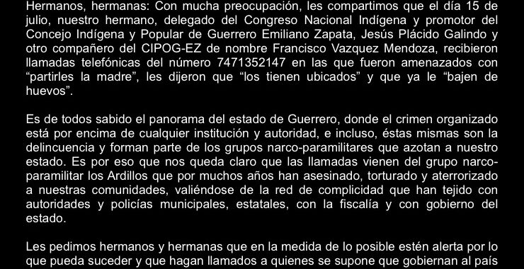 22 JULIO, 2024. Desde la La Comisión de Coordinación y Seguimiento del Congreso Nacional Indígena, condenamos los asesinatos ocurridos el pasado 18 de julio en el Municipio de Chilapa, estado de…