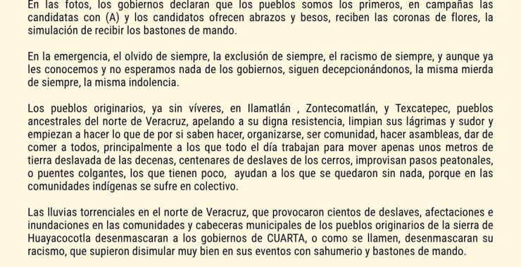 COMUNICADO URGENTE LLAMAMOS A LA SOLIDARIDAD URGENTE CON LOS PUEBLOS ORIGINARIOS DE LA SIERRA NORTE DE VERACRUZ AFECTADOS POR LAS INTENSAS LLUVIAS DE LOS ÚLTIMOS DÍAS A los pueblos de…