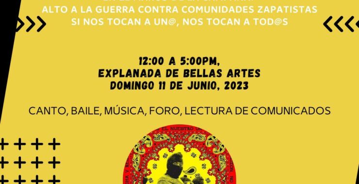 En el marco de la campaña: Alto a la guerra contra las comunidades zapatistas Si tocan a un@, nos tocan a tod@s 12:00 a 5:00 pm Explanada de Bellas Artes, CDMX Domingo…