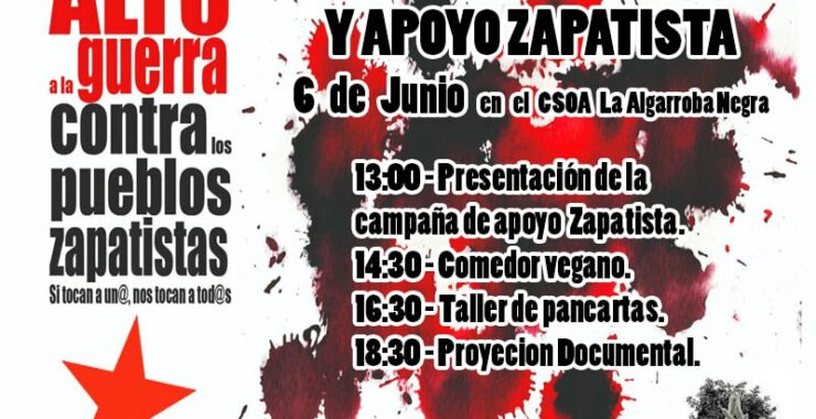 ACCIONES DE DIFUSIÓN Y APOYO ZAPATISTA 6 de hunio en el CSOA La Algarroba Negra 13:00 Presentación de la campaña de apoyo Zapatista 14:30 comedor vegano 16:30 Taller de pancartas 18:30 Proyección…
