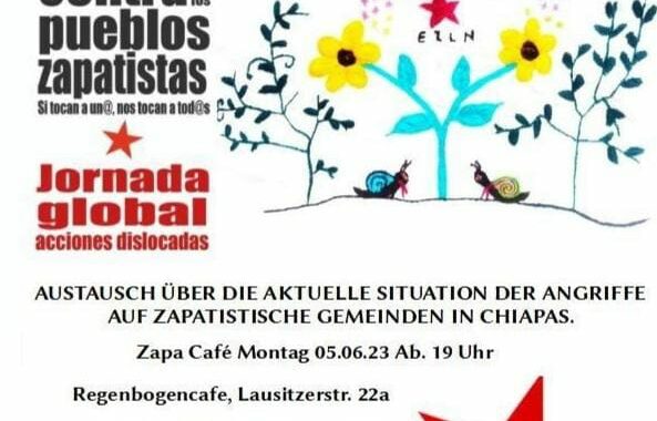 Zapa Café Montag 05.06. 15-22 Uhr geöffnet Diesmal: Es gibt leckere vegane Tacos und wie immer: Kaffe und Kuchen! Ab 19 Uhr: Informeller Austausch über aktuelle Situation der Angriffe auf zapatistische Gemeinden…