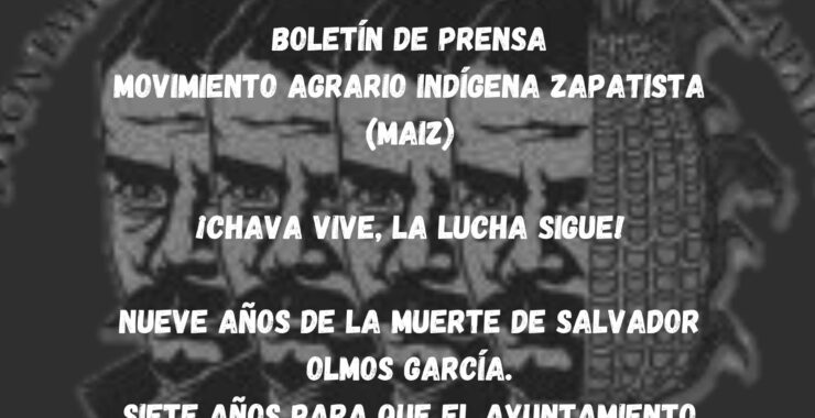 BOLETÍN DE PRENSA Movimiento Agrario Indígena Zapatista (MAIZ) Huajuapan de León, Oaxaca. 20 de agosto de 2025 ¡CHAVA VIVE, LA LUCHA SIGUE! Nueve años de la muerte de Salvador Olmos…