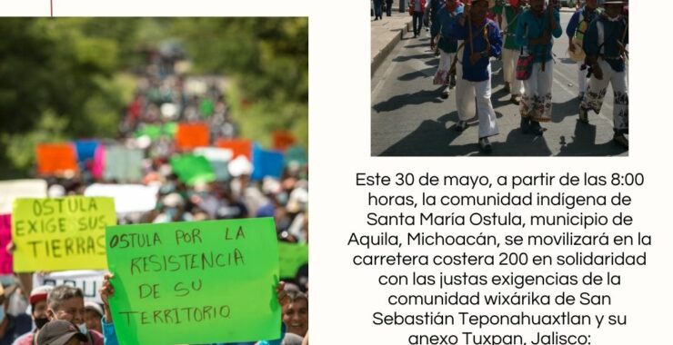 Este 30 de mayo, a partir de las 8:00 horas, la comunidad indígena de Santa María Ostula, municipio de Aquila, Michoacán, se movilizará en la carretera costera 200 en solidaridad con las…