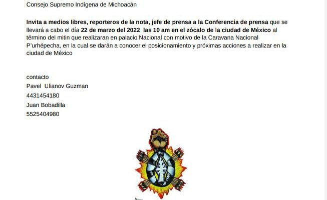 Consejo Supremo Indígena de Michoacán Invita a medios libres, reporteros de la nota, jefe de prensa a la Conferencia de prensa que se llevará a cabo el día 22 de marzo del…