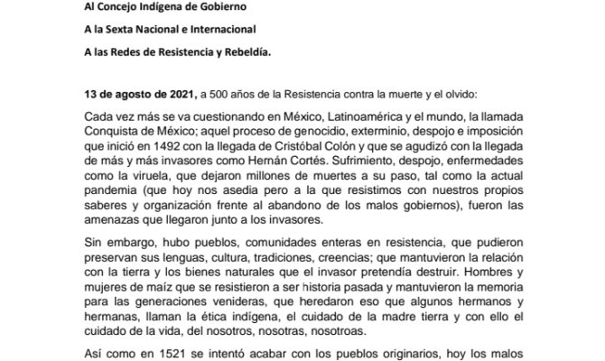 13 de agosto de 1521 – 13 de agosto de 2021 Al Ejército Zapatista de Liberación Nacional Al CCRI-CG-EZLN A la Comisión Sexta del EZLN Al SubComandante Insurgente Galeano Al “Escuadrón 421”,…