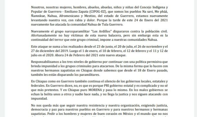 Alcozacan, Corazón de la resistencia. 24 de Enero del 2021. Al Ejercito Zapatista de Liberación Nacional Al Congreso Nacional Indígena CNI Al concejo Indígena de Gobierno CIG A los pueblos de…