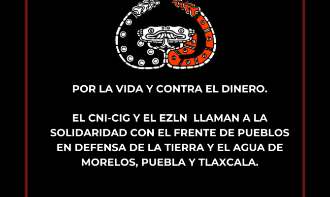 POR LA VIDA Y CONTRA EL DINERO. EL CNI-CIG y el EZLN LLAMAN A LA SOLIDARIDAD CON EL FRENTE DE PUEBLOS EN DEFENSA DE LA TIERRA Y EL AGUA DE MORELOS, PUEBLA Y TLAXCALA.