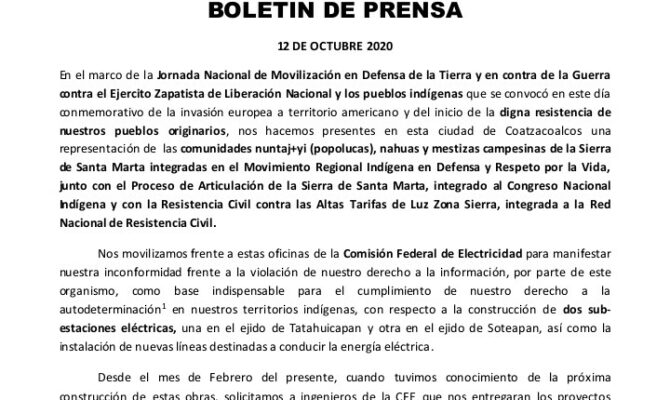 BOLETIN DE PRENSA 12 DE OCTUBRE 2020 En el marco de la Jornada Nacional de Movilización en Defensa de la Tierra y en contra de la Guerra contra el Ejercito Zapatista de…