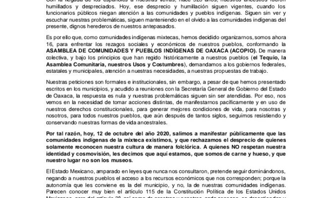 Oaxaca, Oax., a 12 de octubre de 2020 A la opinión pública Al Gobierno de México Al Gobierno del Estado de Oaxaca A los gobiernos municipales A los medios de comunicación A…