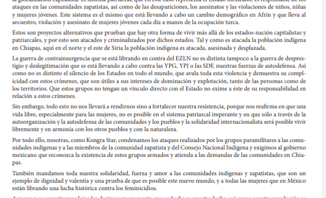 Nosotras, como mujeres del Kurdistán Occidental y como mujeres que luchan, escribimos este comunicado respondiendo al llamado de nuestras hermanas y hermanos indígenas en México ante los ataques que están recibiendo las…