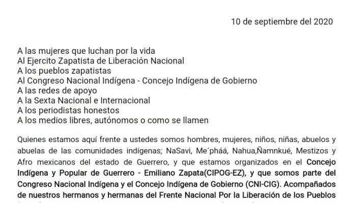 10 de septiembre del 2020 A las mujeres que luchan por la vida Al Ejercito Zapatista de Liberación Nacional A los pueblos zapatistas Al Congreso Nacional Indígena – Concejo Indígena de…