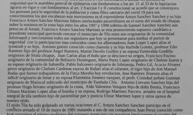 Ejido tila chiapas Mexico a 25 de agosto de 2020 DENUNCIA PUBLICA Al congreso nacional indijena Al concejo indigena de gobierno A los centros de derechos humanos no gubernamental nacional e internacional…