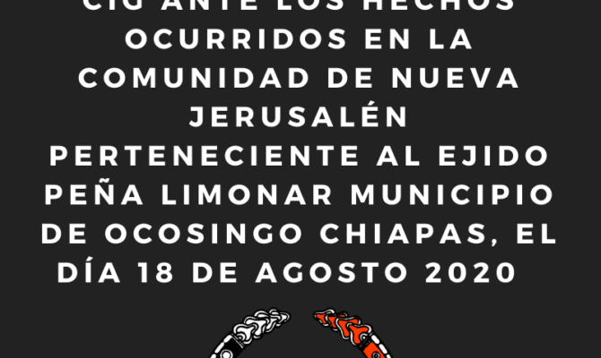 Denuncia de la Coordinación del CNI-CIG ante los hechos ocurridos en la comunidad de nueva Jerusalén perteneciente al ejido Peña Limonar municipio de Ocosingo Chiapas, el día 18 de agosto 2020