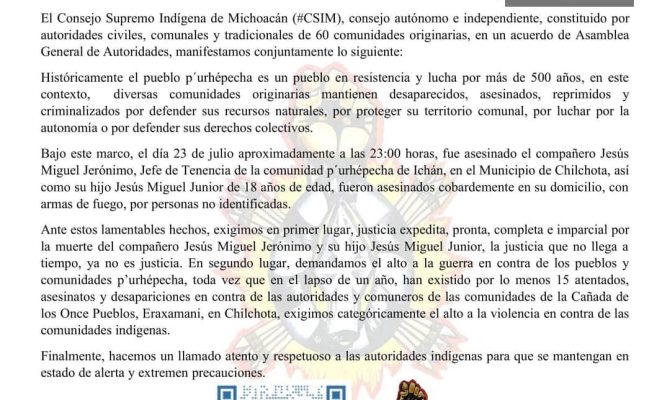 Consejo Supremo exige justicia por el asesinato del Jefe de Tenencia de Ichán y su hijo