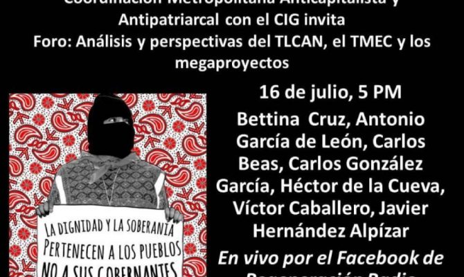 Coordinación Metropolitana Anticapitalista y Antipatriarcal con el CIG invita. Foro: Análisis y perspectivas del TLCAN, y el TMEC y los megaproyectos. 16 de julio, 5 pm Betina Cruz, Antonio García de…