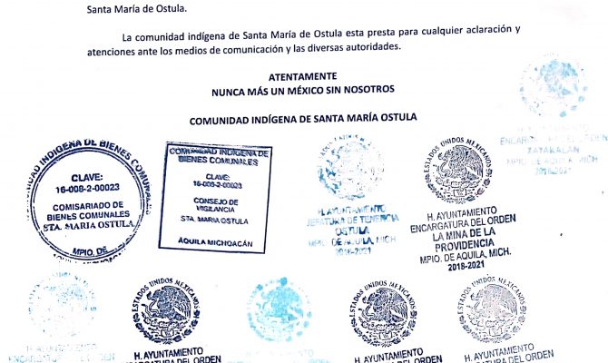 COMUNICADO POR EL QUE LA COMUNIDAD INDÍGENA DE SANTA MARÍA OSTULA ACLARA QUE EL TERRITORIO DE LA COMUNIDAD ESTÁ LIBRE DEL CRIMEN ORGANIZADO Y QUE EL GRUPO CRIMINAL DE CEMEÍ VERDÍA ZEPEDA BUSCA PROVOCAR VIOLENCIA E INESTABILIDAD CON FINES DELINCUENCIALES